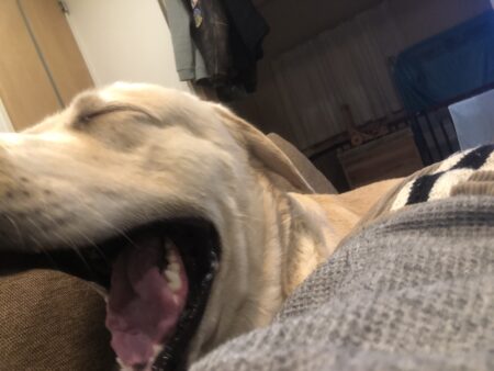 【写真】大あくび現太です。私も大鼾掻いて寝ました。